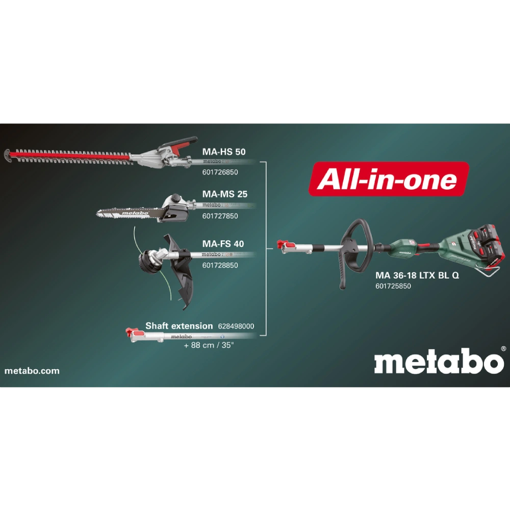 ● Потужний акумуляторний привод 2 x 18 В для насадок; багатофункціональної системи Metabo, рішення «все в одному» для виконання багатьох робіт у садку;