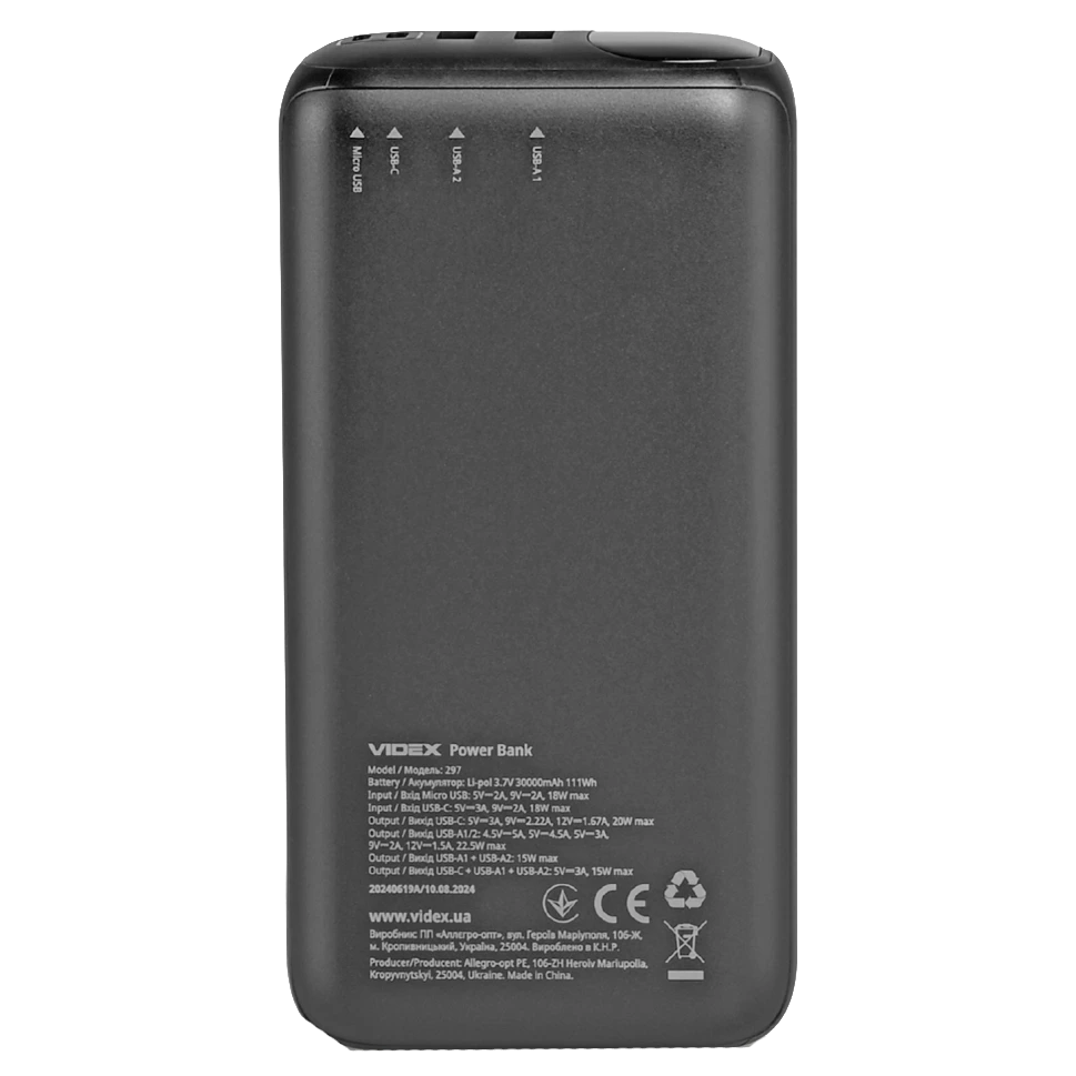 Повербанк VIDEX VPB-297 22.5W Black 30000mAh