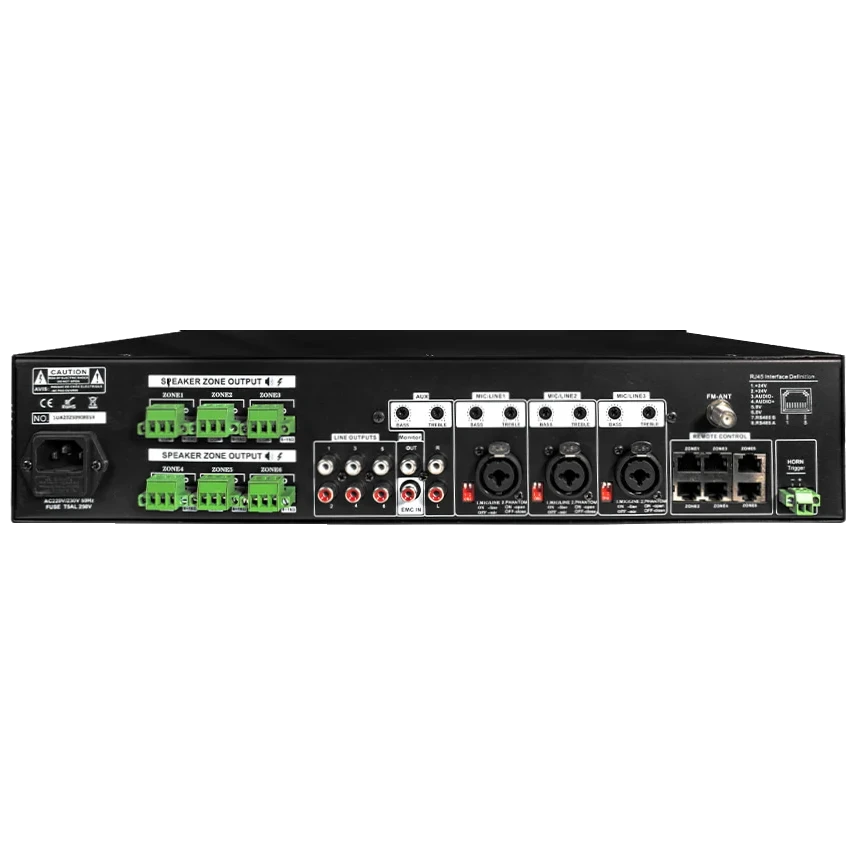 Потужність 120 Вт x6 Особливості зон / груп 6; вихід 100 В або 8-16 Ом; 1 вхід aux та вбудований USB/SD/FM; 3 мікрофонних / лінійних входи балансного XLR Розміри 484 х 405 х 88 мм Розмір упаковки (Ш х В х Г) 560 x 150 x 600 мм Вага брутто 8.32 кг