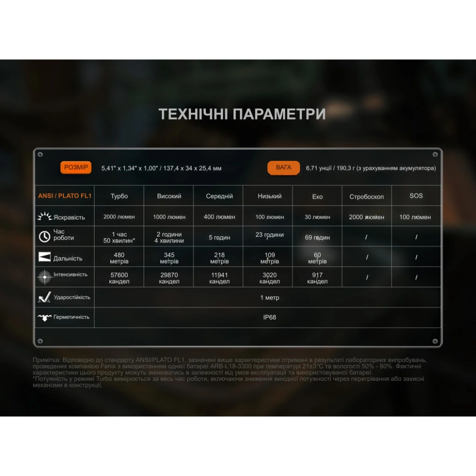 Яркость, люмен 30 - 2000 Время работы от батареи, ч 1.8 - 69 Интенсивность, кандел 917 - 56700 Дистанция, м 60 - 480 Режимы работы Турбо, Высокий, Средний, Низкий, Эко, Стробо, SOS Ударопрочность 1.5 м Класс защиты IP68 Батарея 1 х 18650 (3300 мА•ч) или 2 х CR123A Размеры, мм 137.4 х 34 х 25.4 Вес, г 190.3 Размер упаковки (Ш х В х Г) 40 x 175 x 100 мм Вес брутто 0.03 кг