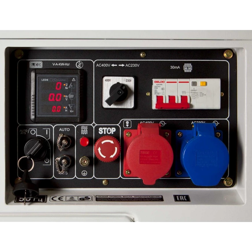 Топливо дизель Розетки 1*32А/1*16А-3-ф Выходное напряжение, В 220/380 Номинальная мощность, Вт 6 500 Максимальная мощность, Вт 7 200 Номинальная сила тока, A 31.3 Тип ДВС 1-но цилиндровый 4-тактный с воздушным охлаждением Тип запуску электро Объем двигателя 498 см.куб Мощность двигателя 13 л.с Объем топливного бака 15 л Уровень шума 72 дБ Размеры 960х560х790 мм Вес 165 кг