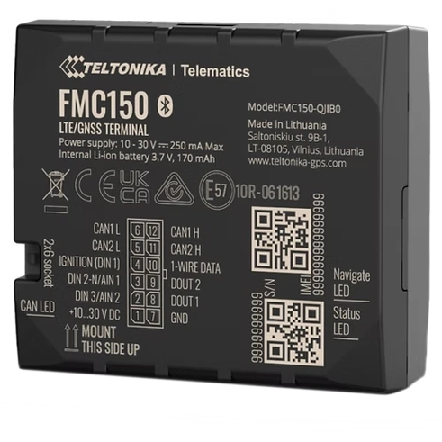 Совместимость 2x CAN Метод работы GSM/GPRS/GNSS/BLUETOOTH® LE Подключение GPS, GLONASS, GALILEO, BEIDOU, SBAS, QZSS, DGPS, AGPS Частотная характеристика LTE CAT 1 LTE FDD: B1/B3/B7/B8/B20/B28; GSM Quad-band 850 / 900 / 1800 / 1900 MHz Питание 6 - 30В DC